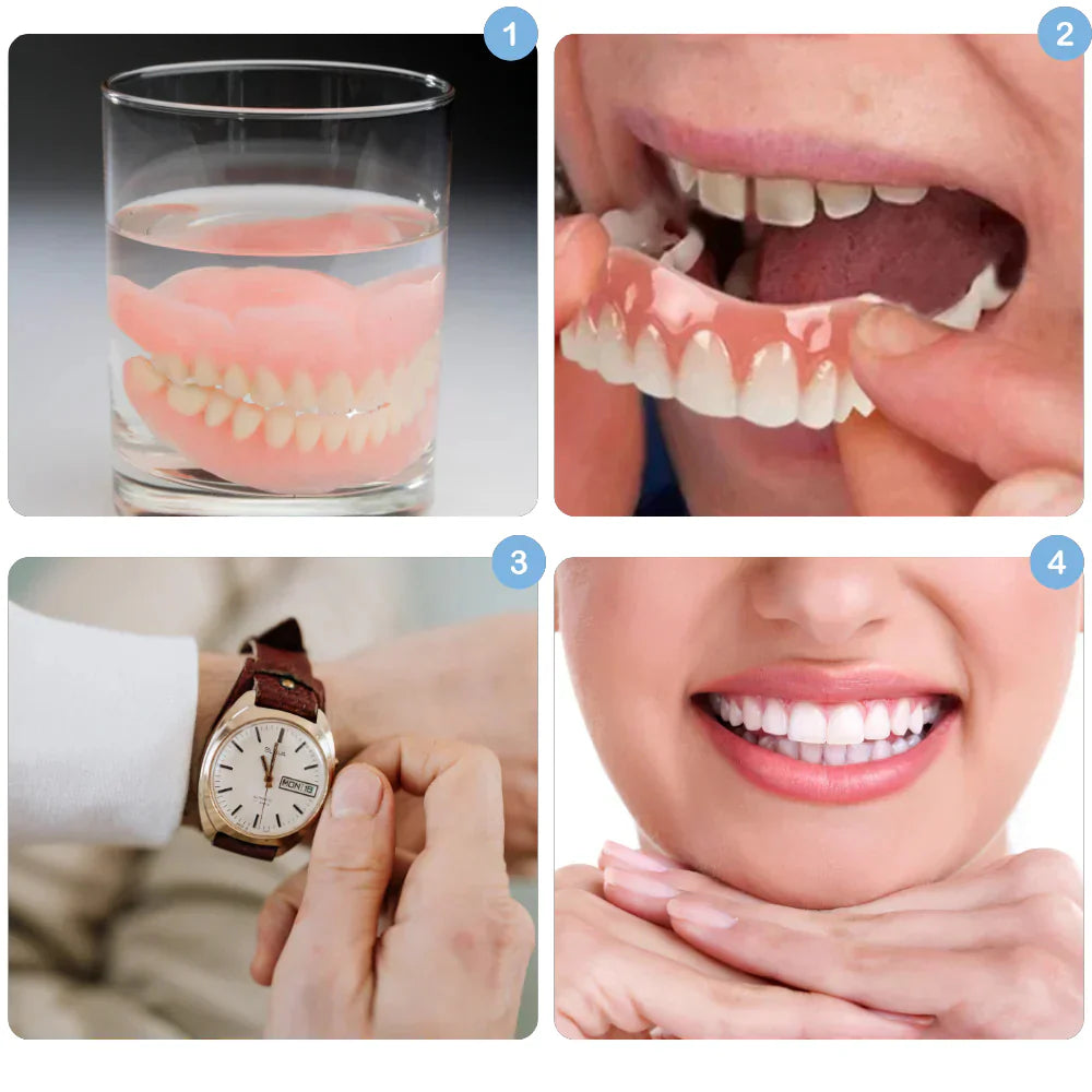 Custom Fit: Remove the prosthesis from the water and let it cool for a few seconds. Then, gently place it over your teeth and gums. Hold it for 1 minute so it adapts perfectly.